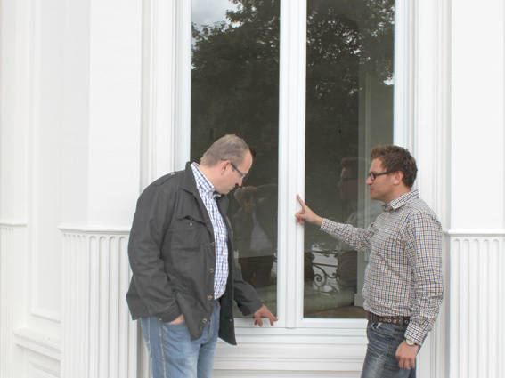 Zu den Highlights im Inneren der ehemaligen arabischen Botschaft gehören die fast raumhohen Fenster, die zur Rheinseite hin einen atemberaubenden Blick auf den Fluss und den sich darüber erhebenden Drachenfels eröffnen. Leider waren die Holzfensterrahmen durch Verschleiß und Witterungsbelastung in einem ziemlich bemitleidenswerten Zustand. Ähnliches galt für die aufwändig strukturierten historischen Kassettentüren. Hier war nicht nur der Lack im Lauf der Jahre stark abgeblättert; das Holz wies auch zahlreiche, zum Teil recht tiefe Risse auf.